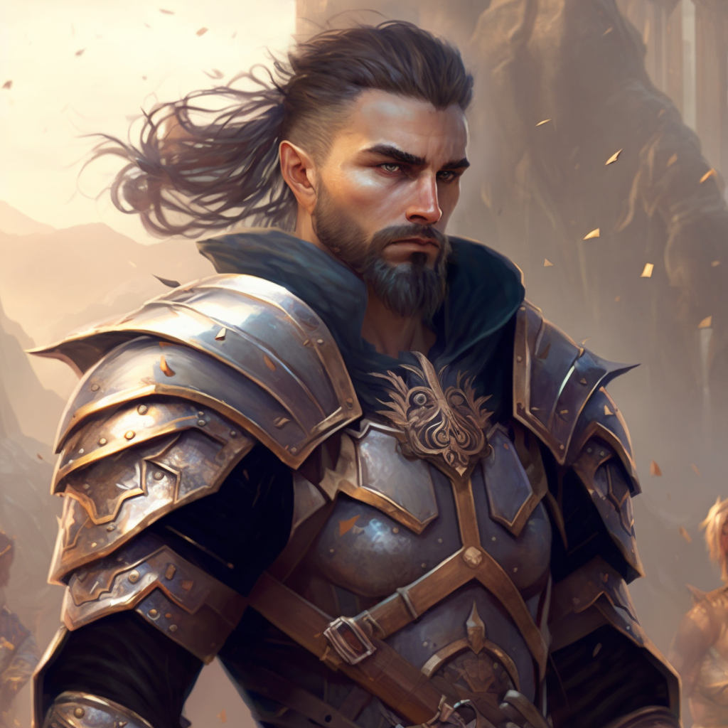 Внешность: Шатен, выглядит лет на 35–40 по человеческим меркам, но с сединой на висках и в аккуратно стриженной бороде. На самом деле ему почти 86. Длинные волосы обычно собраны в хвост, пучок или заплетены в косы на затылке, виски и затылок выбриты (топ кнот). Глаза серые, холодные. Высокого роста, как и все представители его расы, под 190 см. Широкие плечи, хорошо сложен, имеет развитую мускулатуру, но назвать его громилой нельзя, скорее гибкий, ловкий, стремительный. Его, как и прочих представителей расы полукровок можно с легкостью назвать привлекательным, чем обычно пользуется в промежутках между военными походами в знакомствах с прекрасным полом. Порой много пьет, опять же в промежутках между походами, но не злоупотребляет на службе, а зачастую и вовсе отказывает себе в этом. На теле много боевых шрамов от когтей, порезов, колотых ран и ожогов, полученных в бесчисленных сражениях с демонами, культистами и прочей моровой живностью, обитающей в отравленных скверной землях. В боевом походе носит средний по тяжести доспех, чтобы быть достаточно защищенным, при этом иметь скорость и маневренность достойную его возможностей. На территории гарнизона не утруждает себя ношением доспехов, предпочитая удлиненный гамбезон, защищая укрепленной кожаной броней с металлическими вставками некоторые важные участки тела (грудь, плечи спина).